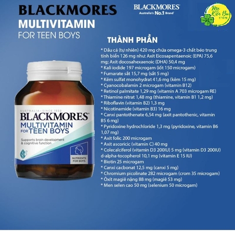 Blackmores Multivitamin for Teen Boys được bào chế với các chất dinh dưỡng thiết yếu để hỗ trợ sự tăng trưởng và phát triển lành mạnh cho các cậu bé tuổi teen. Tại Blackmores, vitamin tổng hợp của chúng tôi được điều chế để cung cấp liều lượng các chất dinh dưỡng quan trọng để hỗ trợ sức khỏe và sức khỏe nói chung của bạn.