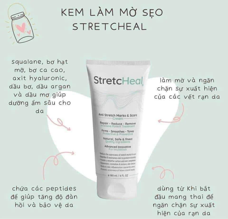 Kem trị rạn StretcHeal là sản phẩm đang được rất nhiều mẹ bầu, mẹ bỉm quan tâm bởi được điều chế từ các hoạt chất peptide kết hợp cùng chiết xuất bơ hạt mỡ, cacao, hạt diêm mạch,….giúp làm mờ các vết rạn xấu xí trên da do ảnh hưởng của quá trình mang thai, sinh nở hoặc tăng cân quá nhanh. Ngoài ra, sản phẩm này còn giúp làm dịu da kích ứng, bổ sung độ ẩm và làm mềm da.