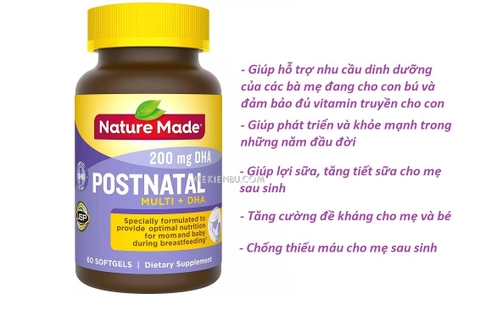 → Nature Made ® Postnatal Multi + DHA 200mg cung cấp đầy đủ vitamin và khoáng chất cho bà mẹ đang cho con bú, với công thức tối ưu (specially formulated) bảo vệ sức khỏe bà mẹ và em bé sau sinh.